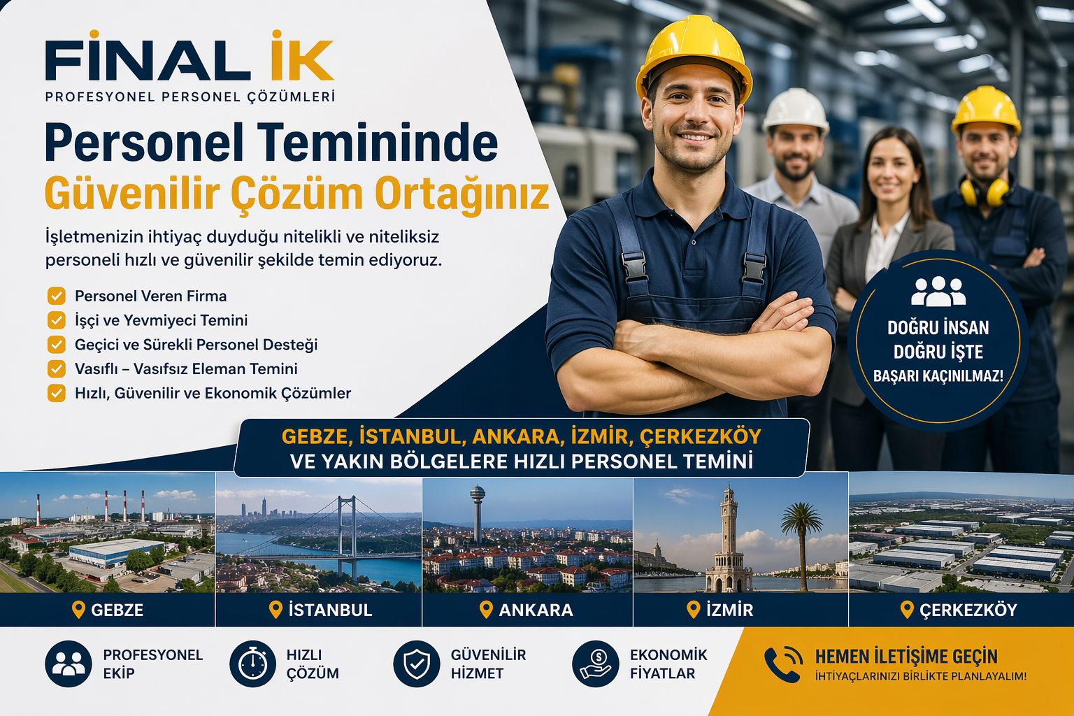 Günümüz rekabet ortamında işletmeler için doğru iş gücüne hızlı ulaşmak büyük avantajdır. Personel veren firmalar, bu ihtiyacı profesyonel şekilde karşılayarak işletmelerin büyümesine katkı sağlar. Gebze, İstanbul, Ankara, İzmir ve Çerkezköy başta olmak üzere birçok bölgede sunulan bu hizmetler sayesinde firmalar, iş süreçlerini daha verimli yönetebilir.